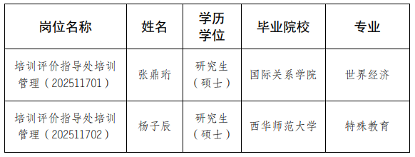 根据事业单位公开招聘工作有关规定,现将我单位2025年度拟聘应届高校毕业生人员情况予以公示。公示期间,如有问题,请向我单位反映,或直接通过中央和国家机关所属事业单位公开招聘服务平台反映。