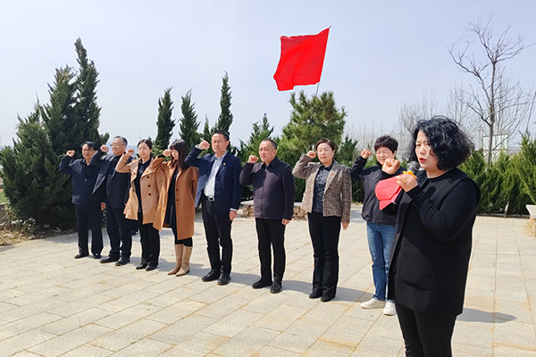 全体党员向仰望顶战役纪念碑敬献花篮,为在抗日战争中牺牲的八路军默哀,重温入党誓词。大户陈家村党委书记陈松海,指着村头不远处的仰望顶,与大家共同重温了1942年八路军山东纵队第五旅十三团英勇抗击日本侵略者的感人故事以及悲壮的胶东抗战史。