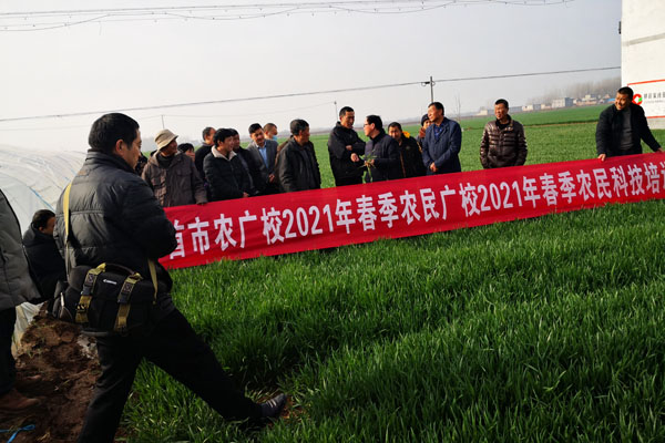 本网讯 为深入贯彻落实中央一号文件精神关于实施乡村振兴战略工作部署,提升农民科技文化素质,助推安徽省界首市乡村振兴。按照中央校、省校2021年冬春农民科技培训工作通知精神,结合界首市各乡、镇产业生产实际。自3月3日起,界首市农广校在全市18个乡镇街道开展2021年春季农民科技培训工作,为做好此次培训工作,界首市农广校根据各乡镇农业产业生产实际,采取“五定”(定培训学员、定培训内容、定培训教师、定培训时间、定培训场地)举措,精心制定培训方案和计划,有以前的室内培训转变成室外田间地头培训。使培训内容、培训方式更贴近农业生产。培训内容重点围绕中央一号文件精神,实施乡村振兴战略政策解读、界首市农业惠农政策,当前农作物田间管理技术等内容开展培训。本次培训,对今年春季麦田管理起到了及时的指导作用,受训群众纷纷表示,要抓住当前有利时机把小麦管好,为持续夺取粮食连年丰产打好基础。