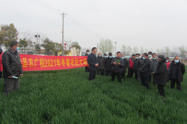 本网讯 为落实中央校、省校以“强技术、稳生产、促保供”为主题的2021年冬春农民大培训工作精神,3月5日,安徽省太和县农广校在太和县兴侠家庭农场农民田间学校举办了春季小麦田管及春耕备耕农民培训班,来自原墙镇及周边乡镇的种植大户、农民专业合作社成员、家庭农场主等新型农业经营主体的骨干力量和金土地有限公司小麦良种繁育基地的种植示范户50余人参加了培训。