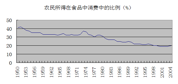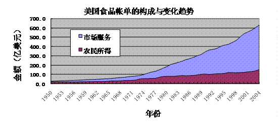 我来跟大家描述一下,首先这个图上面指的是从1950年开始到2004年中,美国人在食品上的消费金额,从1950年的40亿美元增长到现在六百多亿美元。其中有两个颜色,一个颜色表示市场所得,另一个颜色表示农民所得。市场所得指的是销售、运输、储藏、加工、营销、餐饮等等。农民所得是指农民通过种植、养殖所换取的收入。