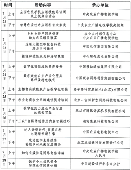 农民手机培训周期间(7月22—28日),每天上午专场活动9:00开始直播、下午专场活动14:00开始直播,相关活动安排如下。