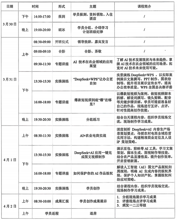 为推动人工智能技术与农业生产经营深度融合,提升农业数字化转型水平,我单位将于3月底在山东省烟台市举办第一期“AI智农・播创未来实操训练营”,现将相关事宜通知如下:
