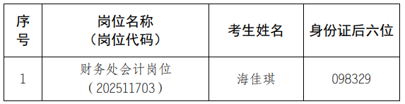 因我单位财务处岗位进入体检、考察考生自愿放弃,根据农业农村部在京单位2025年度公开招聘有关规定,经单位党委会议研究,该岗位按照笔试、面试综合成绩由高到低顺序,递补进入体检、考察人选名单如下:
