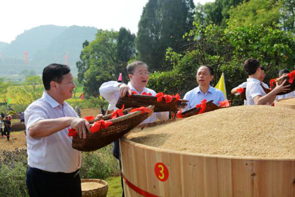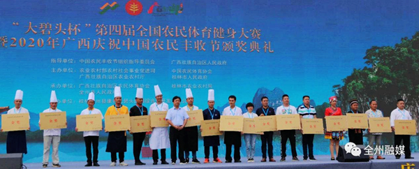 本网讯 由“中国农民丰收节”组织指导委员会、广西壮族自治区人民政府指导,农业农村部农村社会事业促进司、中国农民体育协会、广西壮族自治区农业农村厅、桂林市人民政府主办,广西壮族自治区农民体育协会、桂林市农业农村局、全州县人民政府承办,桂林全州县康养大碧头田园综合体开发有限公司协办的“大碧头杯”第四届全国农民体育健身大赛暨2020年广西庆祝中国农民丰收节活动启动仪式,于9月15日在全州县康养大碧头田园综合体隆重举行。自治区人大常委会副主任、桂林市委书记赵乐秦代表桂林市致辞,自治区副主席方春明代表自治区致辞,农业农村部党组成员、副部长刘焕鑫宣布“大碧头杯”第四届全国农民体育健身大赛暨2020年广西庆祝中国农民丰收节活动启动仪式开幕。农业农村部农村社会事业促进司司长李伟国主持开幕式。