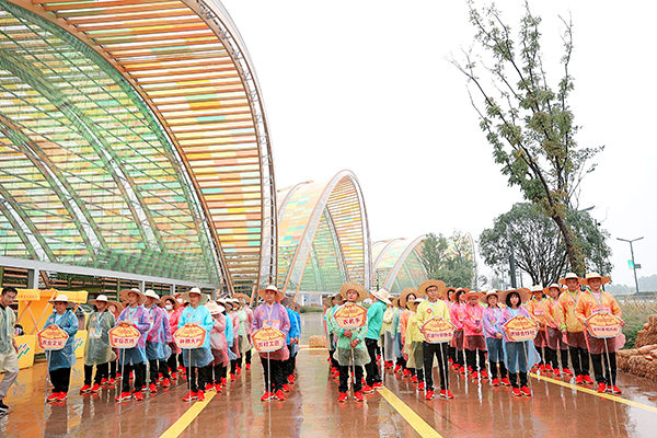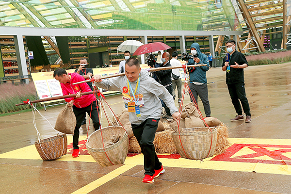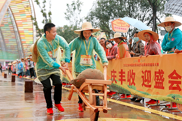 中国农民丰收节农民体育健身大赛以“庆丰收 迎盛会”为主题,是第五个中国农民丰收节主会场的重要内容之一。设晒场收谷庆丰年、车轮滚滚向未来、瓜果连连共富裕、接续奋进促振兴4个赛项,寓意在乡村振兴道路上农民朋友越来越富裕、越来越幸福,不仅为广大农民体育健身爱好者搭建了展示交流的平台,同时有效促进农村体育健身公共服务水平和乡村居民身心健康水平双提升,全面激发起农民文化体育助力乡村全面振兴的强大力量,彰显广大农民群众和三农工作者辛勤耕耘、砥砺奋进的信心与决心。欢快热情的广场舞、抖空竹展演之后,比赛正式拉开序幕。来自成都市的农业企业、农民专业合作社、家庭农场、集体经济组织、种粮大户、养殖大户、农村工匠、返乡创业大学生、农业职业经理人、农机手、农产品营销大户、农业行业协会、脱贫致富带头人、供销合作社、农村科技特派员、农村疫情防疫等16支新型农业经营主体代表队参赛,在比赛中礼赞了丰收、展示了风采、收获了喜悦。