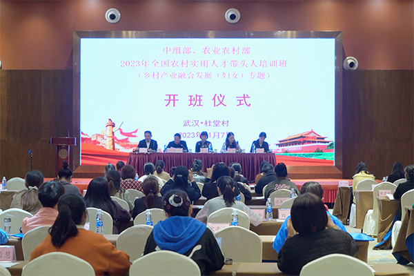 本网讯 11月7日,2023年中央组织部、农业农村部农村实用人才带头人和到村任职、按照大学生村官管理的选调生等培训乡村发展主题乡村产业融合发展专题培训班在湖北省杜堂村基地开班。中央农业广播电视学校师资培育处刘丹处长出席开班式并讲话。杜堂村第一书记葛天才和来自湖北省的100名家庭农场主,农民合作社带头人、农业企业负责人、农业社会化服务组织带头人等参加开班式。开班式由武汉市黄陂区农业农村局副局长陈明生主持。