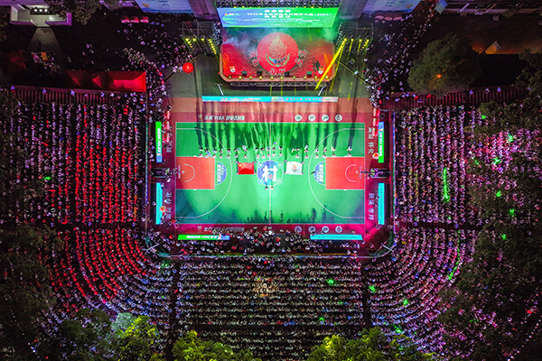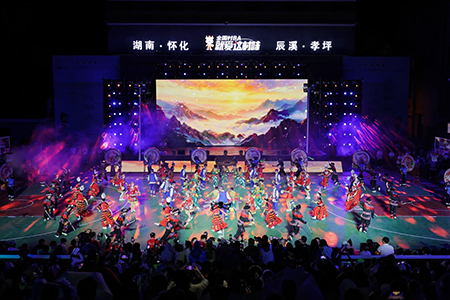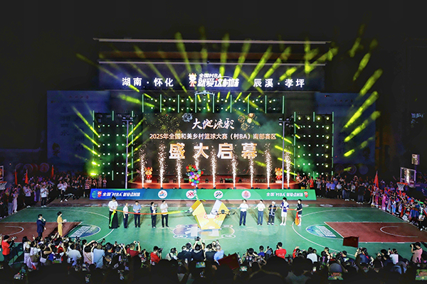 全国“村BA”南部赛区比赛在“湘”味浓郁的“村晚”中激情启幕。以球场为舞台,历史悠久的傩舞、节奏热烈的苗鼓、刚劲有力的瑶族刀舞、活灵活现的社塘木偶戏、高亢嘹亮的辰溪茶山号子等精彩的非遗节目轮番登场,生动地诉说着湘西大地古老的农耕文明故事。而科技感十足的机器人舞蹈、沉浸体验的全息投影、引人入胜的情景短剧,又将辰溪孝坪“百年兵工镇”厚重的红色文化,与湖南作为“工程机械之都”的科技创新成果一一呈现。活动特别发布全国“村BA”主题曲《为村而战》,辰溪籍演员成毅也回到家乡,为全国“村BA”加油,将现场气氛推向高潮。