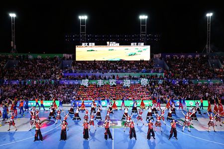 全国“村BA”中部赛区在极具土家族特色的《土家迎客歌》与《六口茶》歌舞中开启,以浓墨重彩的文化笔触绘就全国“村BA”以赛促文、以文兴村的振兴图景。整场文艺展演分为“土苗风韵”“八方来客”“直尕思得”三大篇章,节目《鼓舞咸丰》《咸庆丰年》《来的都是客》等深度融合非遗文化、农耕记忆与民族歌舞,不仅生动呈现鄂西南地区深厚的文化底蕴,更彰显“村BA”在涵养文明乡风、凝心聚力、强身健体的重要作用。当晚进行的揭幕战充分展现乡村篮球凝聚乡村人气、激发振兴活力的平台作用,打造出一场真正属于农民、扎根乡村、助力振兴的体育文化盛会。