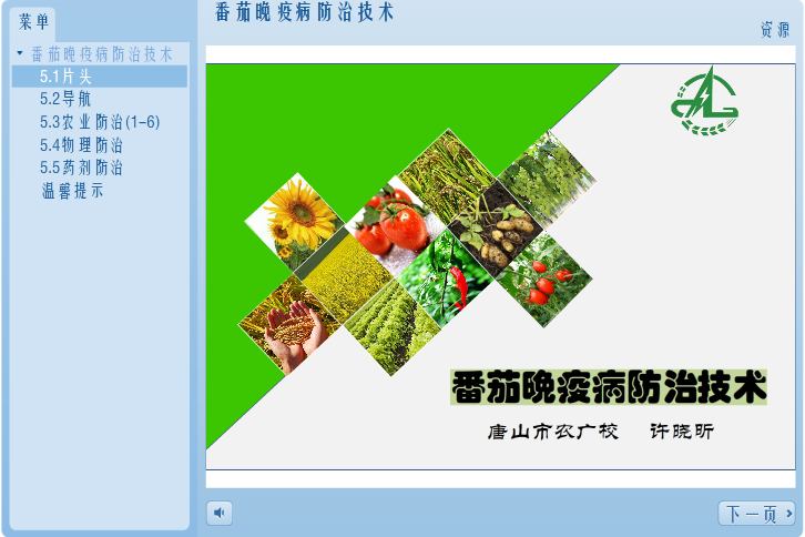 本课程从农业防治、物理防治和药剂防治三个方面对番茄晚疫病防治方法进行详细的讲解,在药剂防治方法上,重点讲解了药剂种类、喷药技术和施药方法。