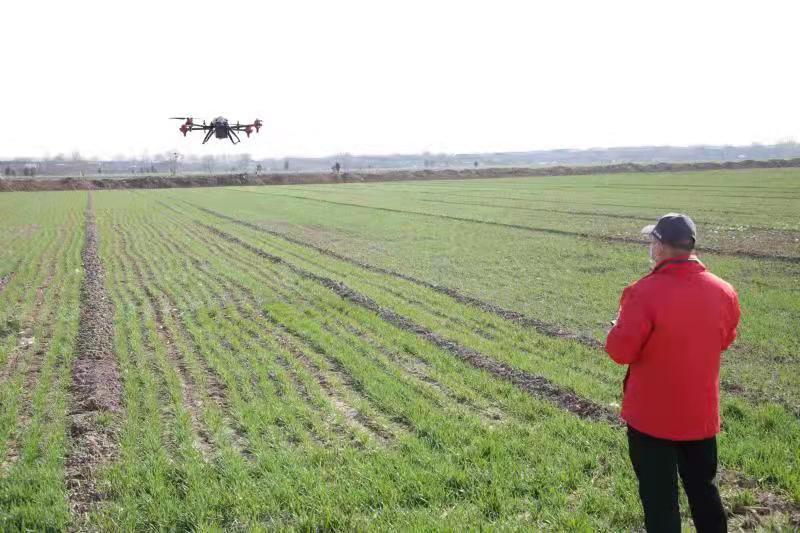 ▲ 武陟县大虹桥乡岳马蓬村雨鑫农业科技公司工作人员利用无人机在麦田作业
