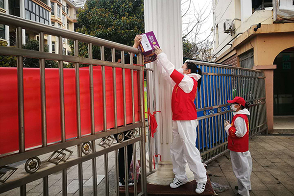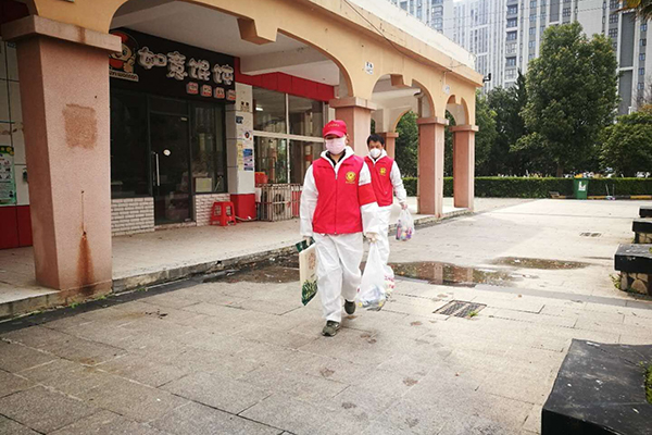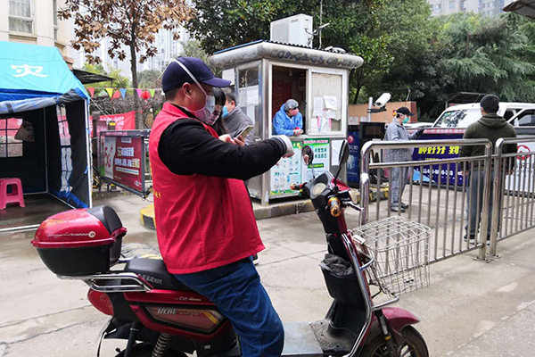 小区严格管控后,居民生活必需品购买需求大,小区里老人多,也不会使用手机团购。为解决问题,武汉市砺志中学的党员志愿者郑志刚就当起了居民的“跑腿员”,每天在小区中门和门外的中百超市间来来回回几十趟。在得知小区需要夜班值守时,他主动请缨,“我是男同志,我来参加值夜班!”