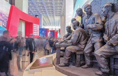 11月18日,观众在观看安徽小岗村农民按下包产到户“红手印”的雕塑。新华社记者才扬摄