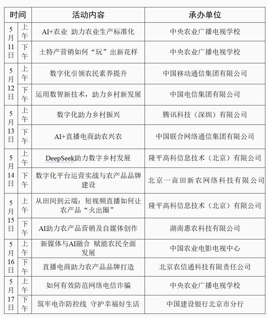 农民手机培训周期间(5月11日—17日),每天上午专场活动9:30开始直播、下午专场活动14:30开始直播,相关活动安排如下。
