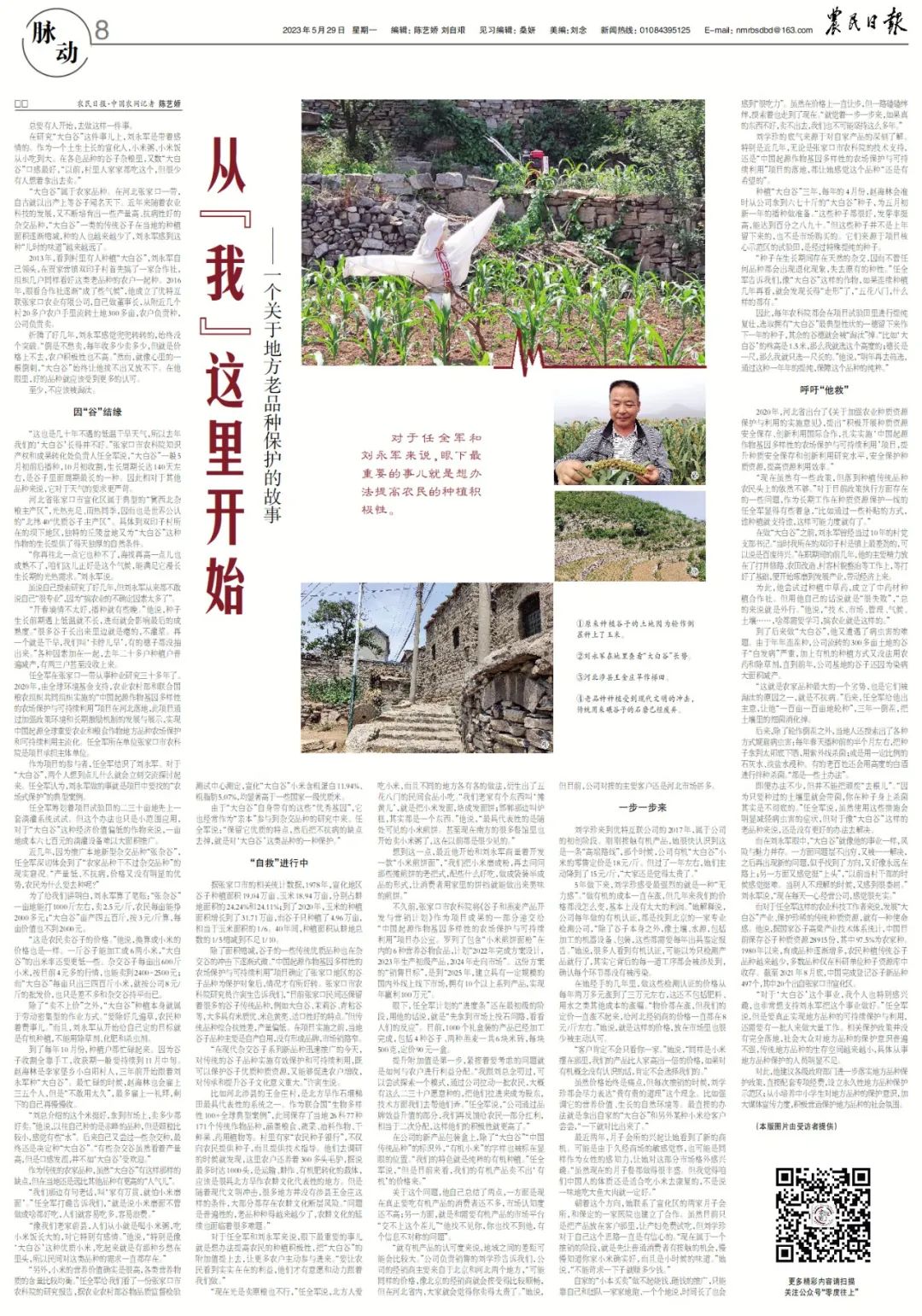 “像我们老家蔚县,人们从小就是喝小米粥,吃小米饭长大的,对它特别有感情。”他说,“特别是像‘大白谷’这种优质小米,吃起来就是有那种乡愁在里头,所以民间对这类品种的需求一直都存在。”